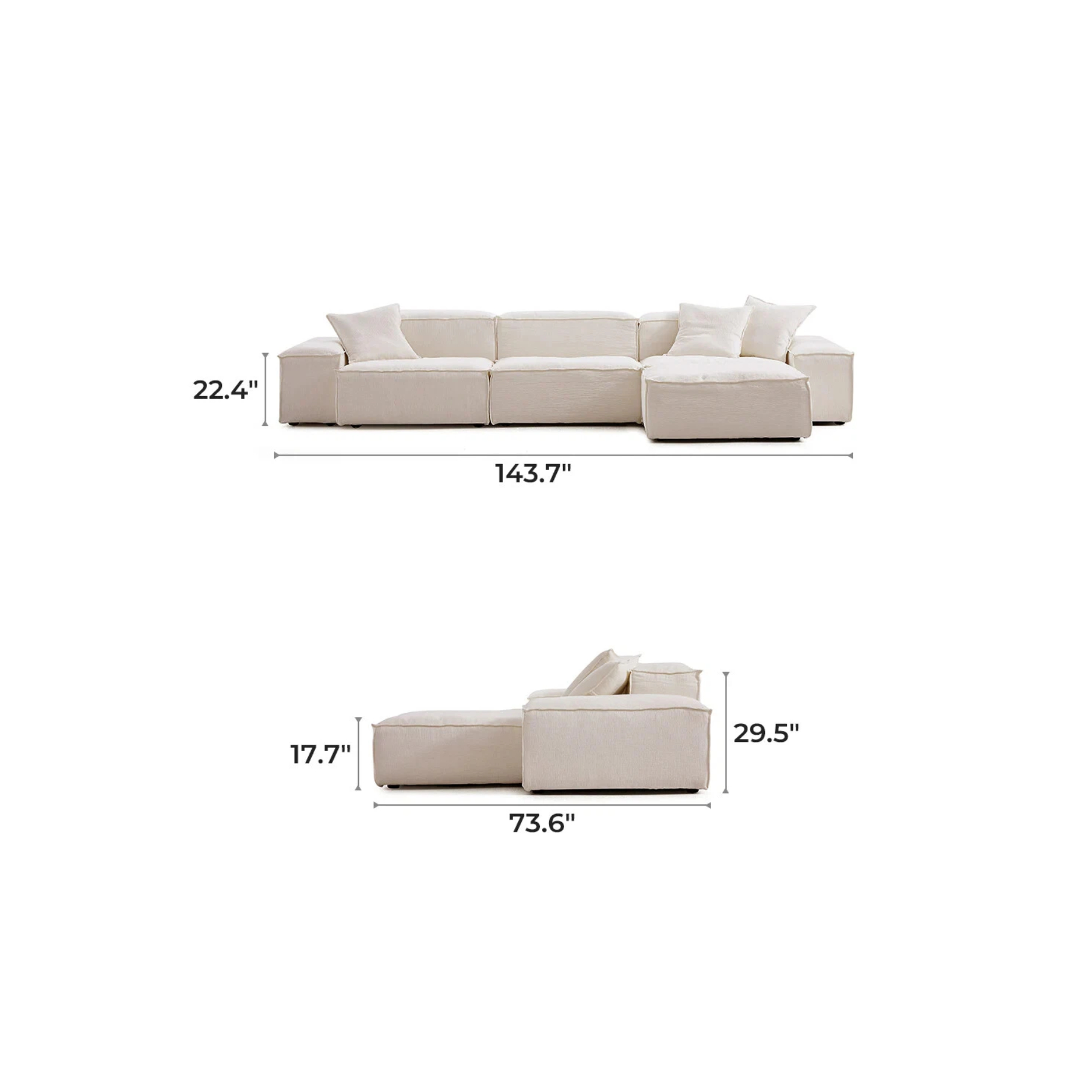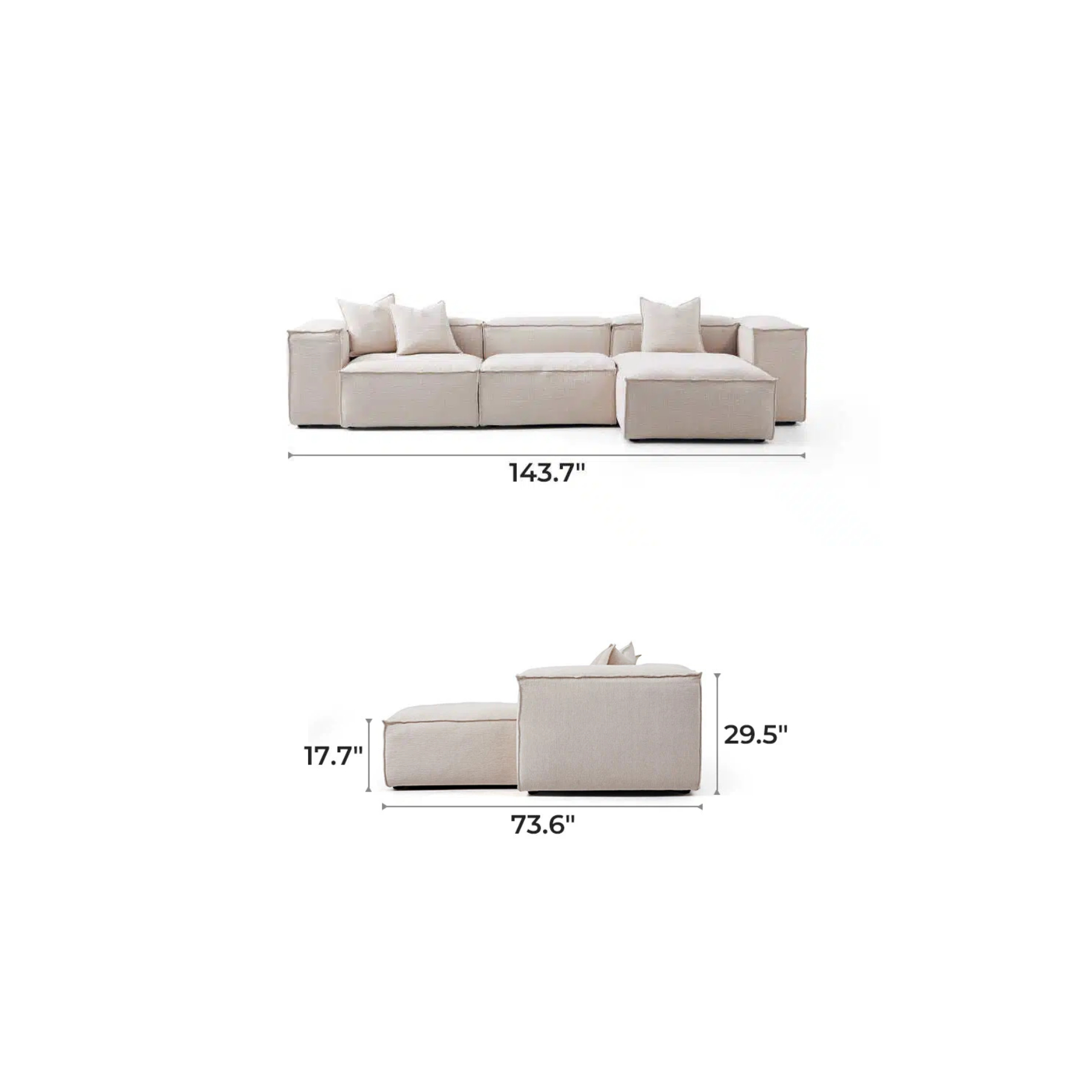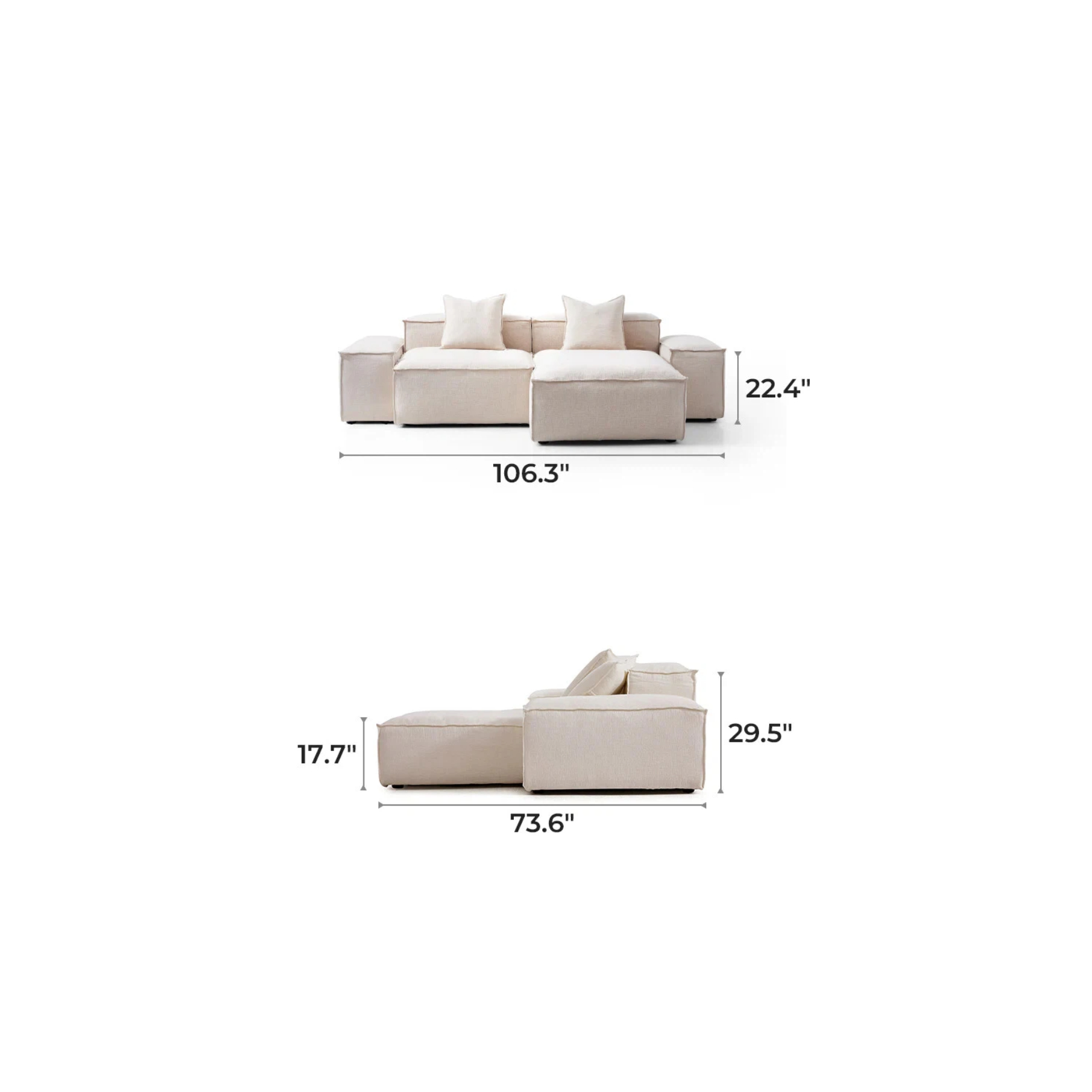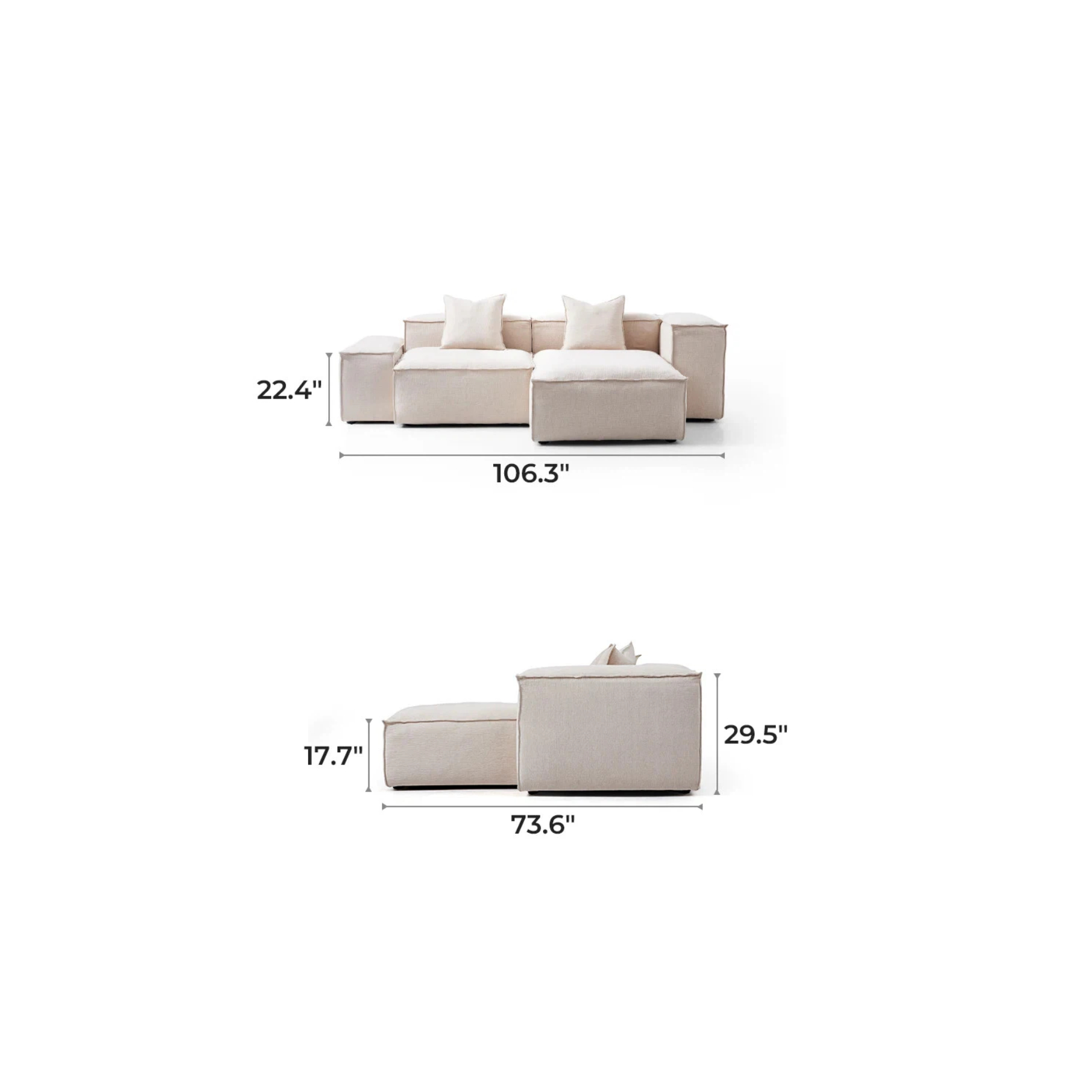 General Dimensions  106.3″ L× 73.6″ D× 29.5″ H