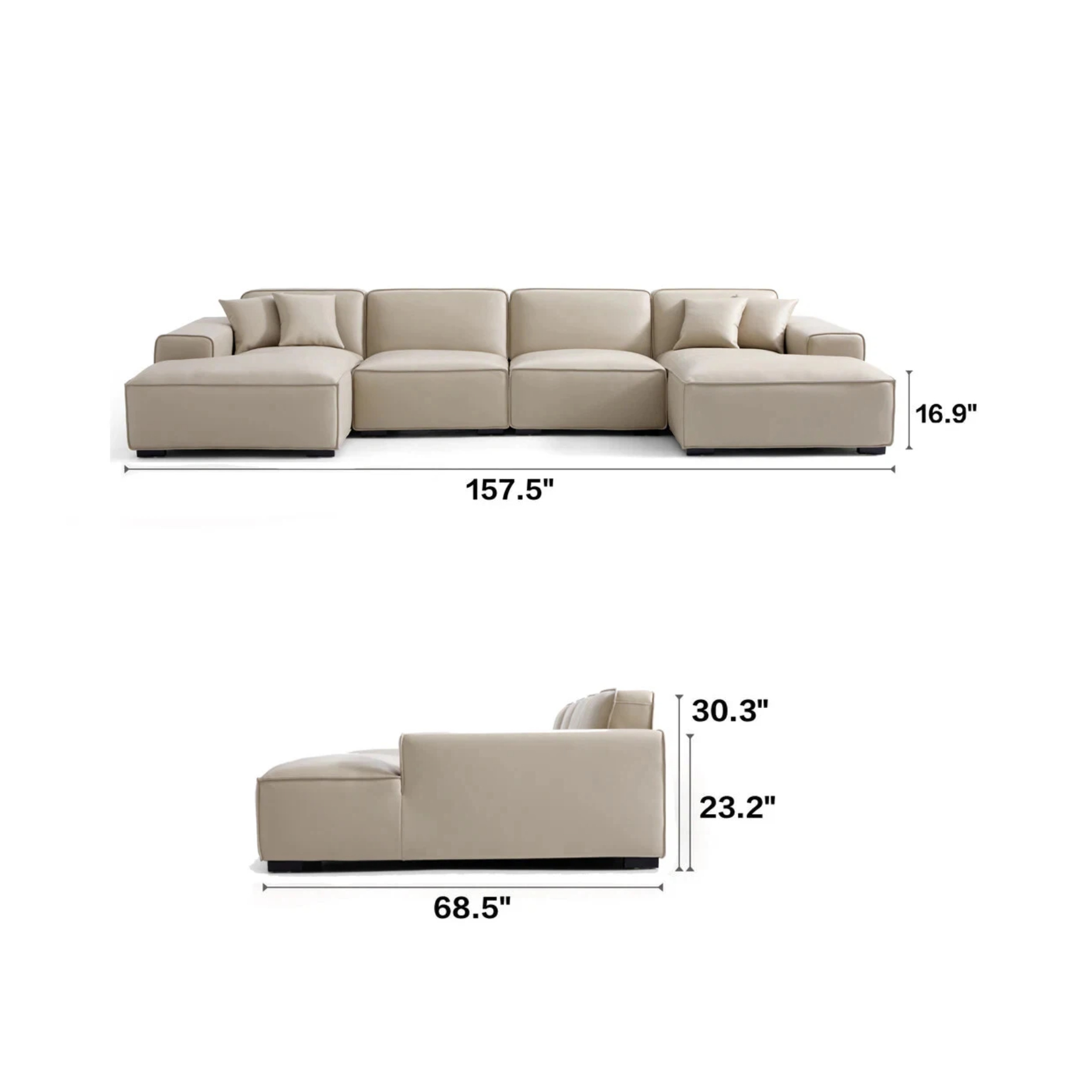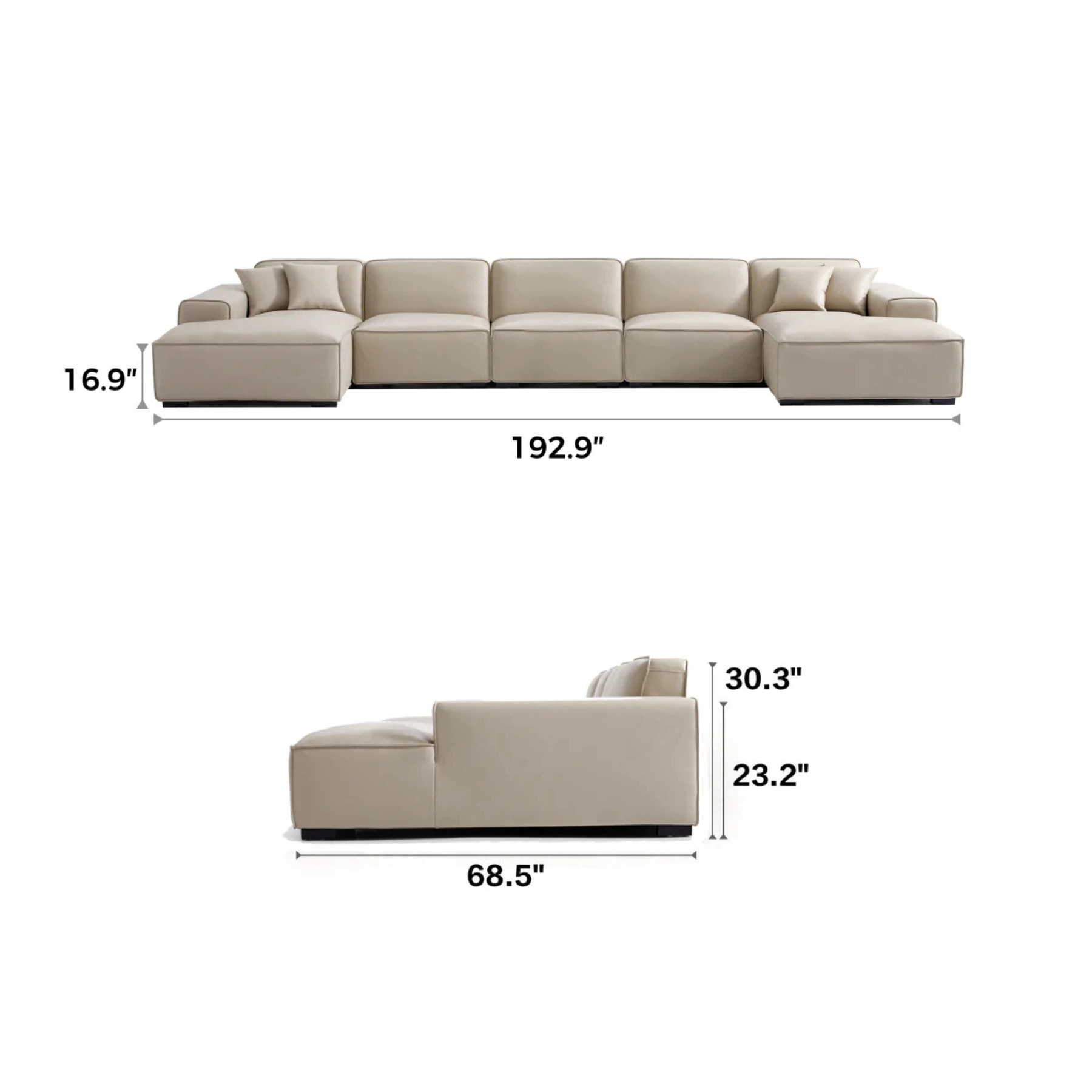 Modern, high-quality, soft, and durable, Domus double chaise sectional offers spacious seating, making it ideal for family gatherings and social events, comfortably accommodating up to 6 people. With its modular design, customization is supported, allowing you to tailor it to your space. Toss pillows are included for added comfort and style.