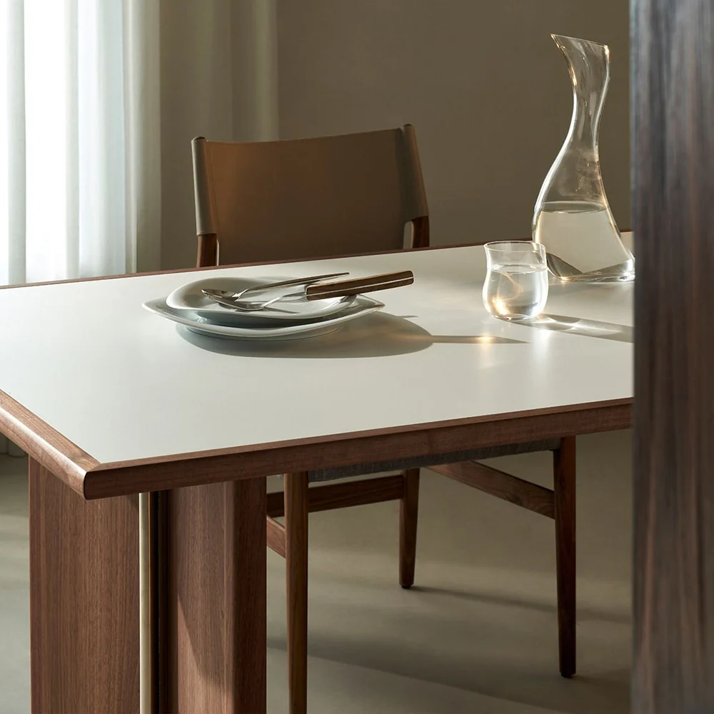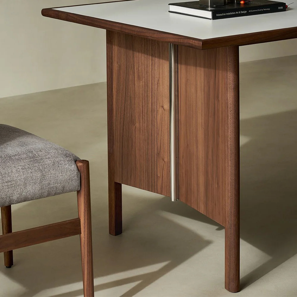 The Draper Rectangular Dining Table blends modern architectural design with timeless materials. Featuring an Italian matte stone tabletop, rounded edges for comfort, and a sculptural black walnut base with V-fold legs, it offers exceptional stability and visual lightness. Designed for contemporary dining rooms, this modern dining table balances durability, elegance, and everyday functionality.