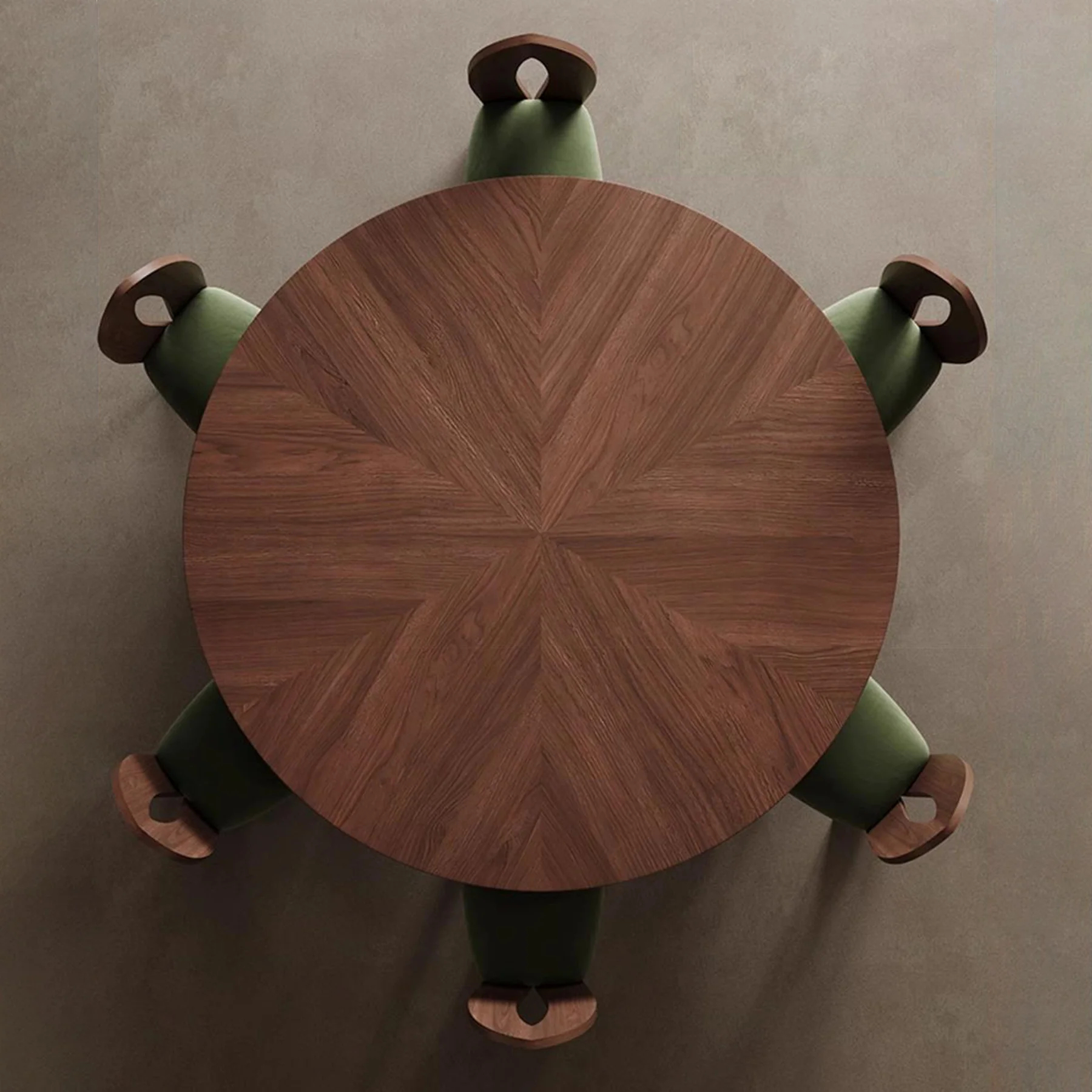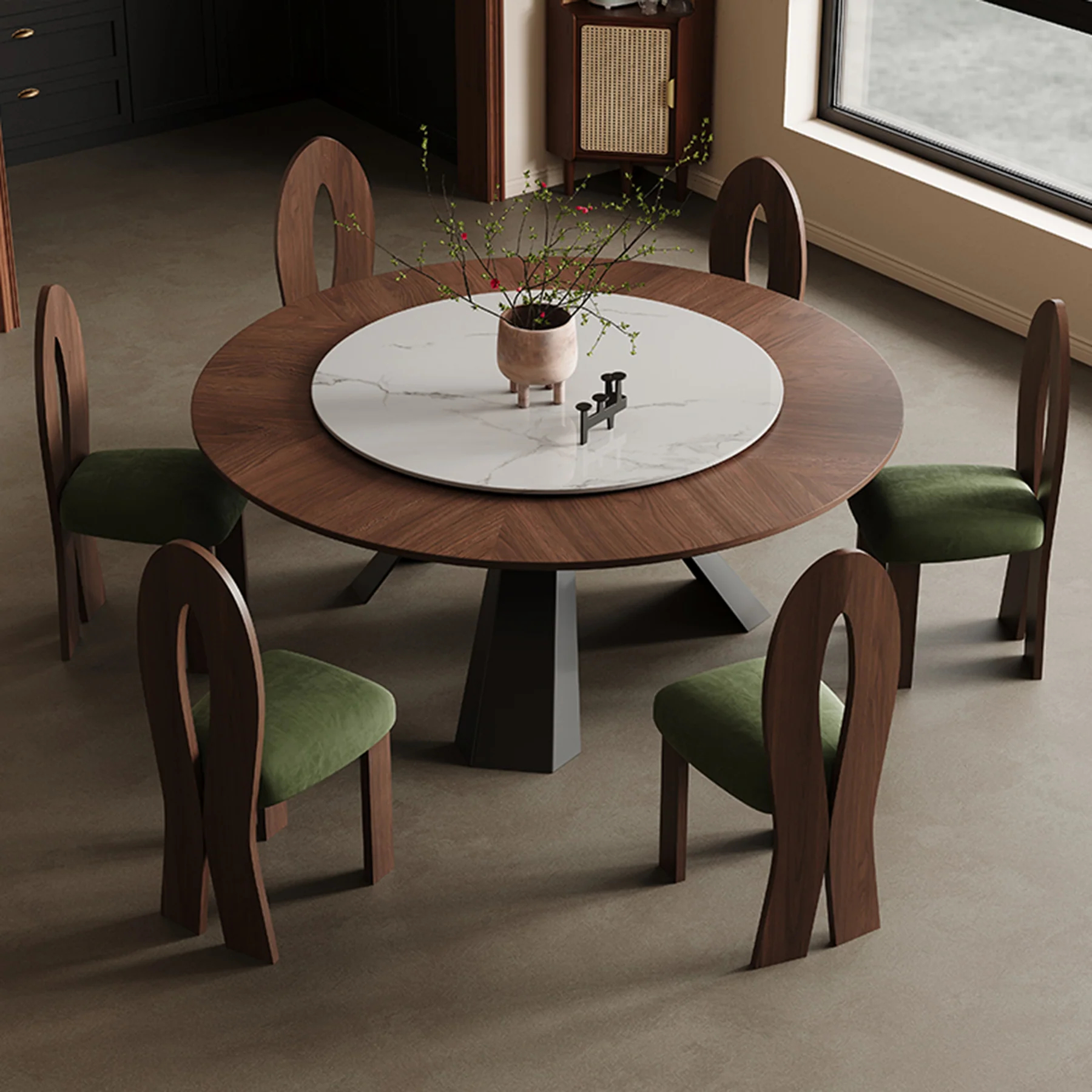 The Halo Round Dining Table blends mid-century French style with modern craftsmanship to elevate any dining room. Its black walnut parquet tabletop showcases beautiful natural grain, providing a durable, warp-resistant surface with long-term stability. A detachable Lazy Susan—available in natural Milan White Jade stone or solid wood—spins smoothly and offers flexible dining convenience. The carbon-steel base adds exceptional strength and a refined contemporary look. Finished with a sculpted, layered tabletop and gently rounded, polished edges, this solid-wood round dining table delivers both visual depth and a soft, luxurious touch.