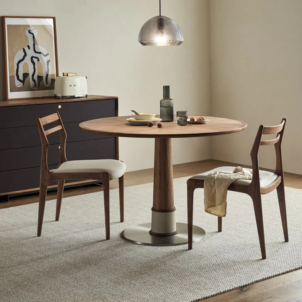 The Kamile Round Dining Table blends timeless solid wood craftsmanship with modern pedestal design. Its round tabletop encourages better conversation and connection, while the single-leg base maximizes seating flexibility and saves space. Finished with a matte brushed stainless steel base and reinforced with a hidden weighted core, Kamile offers exceptional stability and everyday durability. A perfect round dining table for modern, Scandinavian, or mid-century inspired interiors.