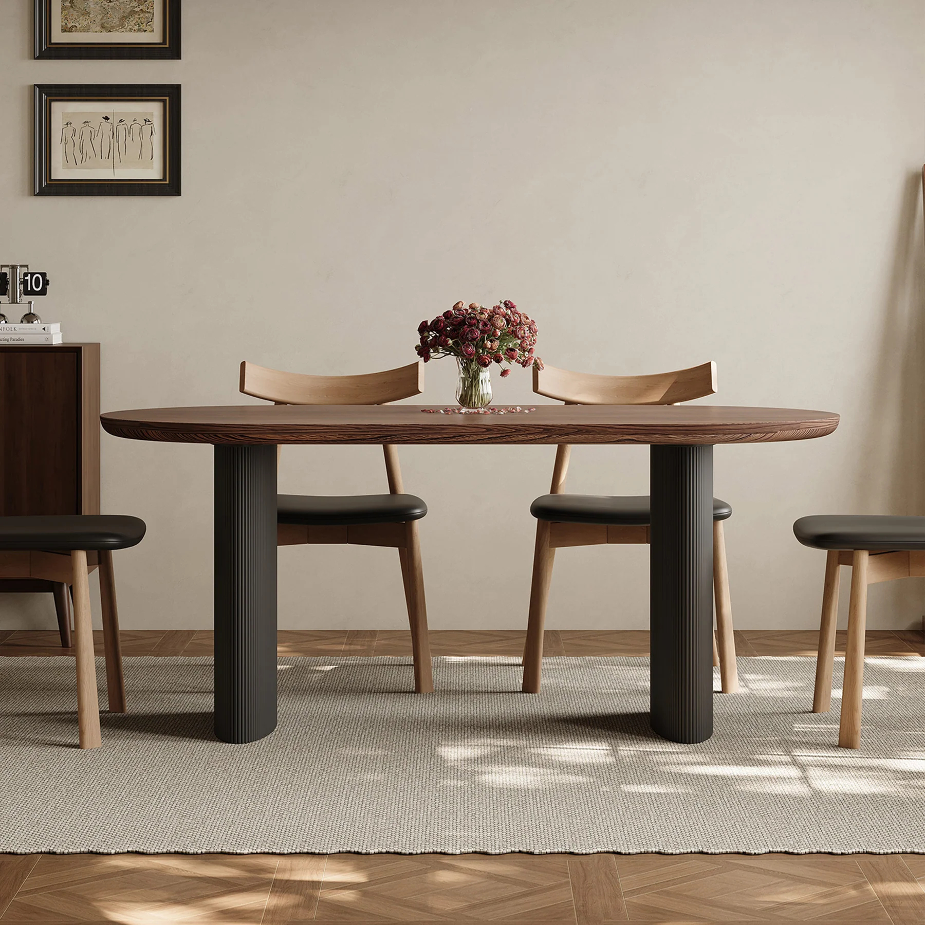Crafted with a rich walnut elm-veneer top, this table brings a warm, organic tone that elevates any dining space. The smooth, elongated oval silhouette softens the room and adds an understated designer aesthetic.